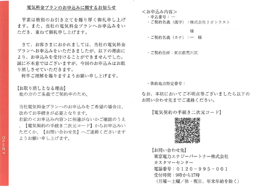 当初は受付けられましたが、後日、東京電力より「開栓手続き取消」の通知が届きました。
