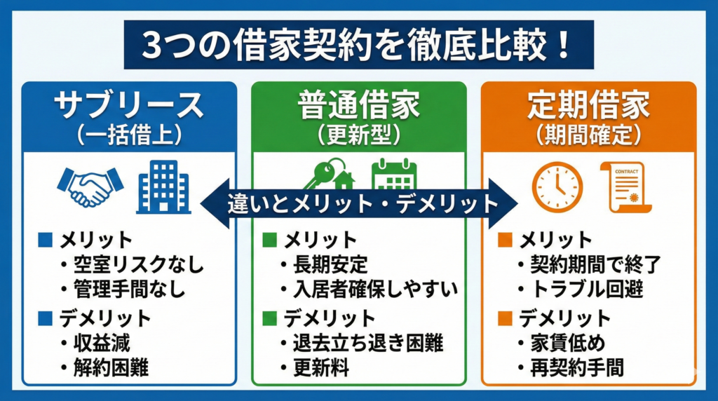 サブリース・普通借家・定期借家の違いとメリット・デメリット